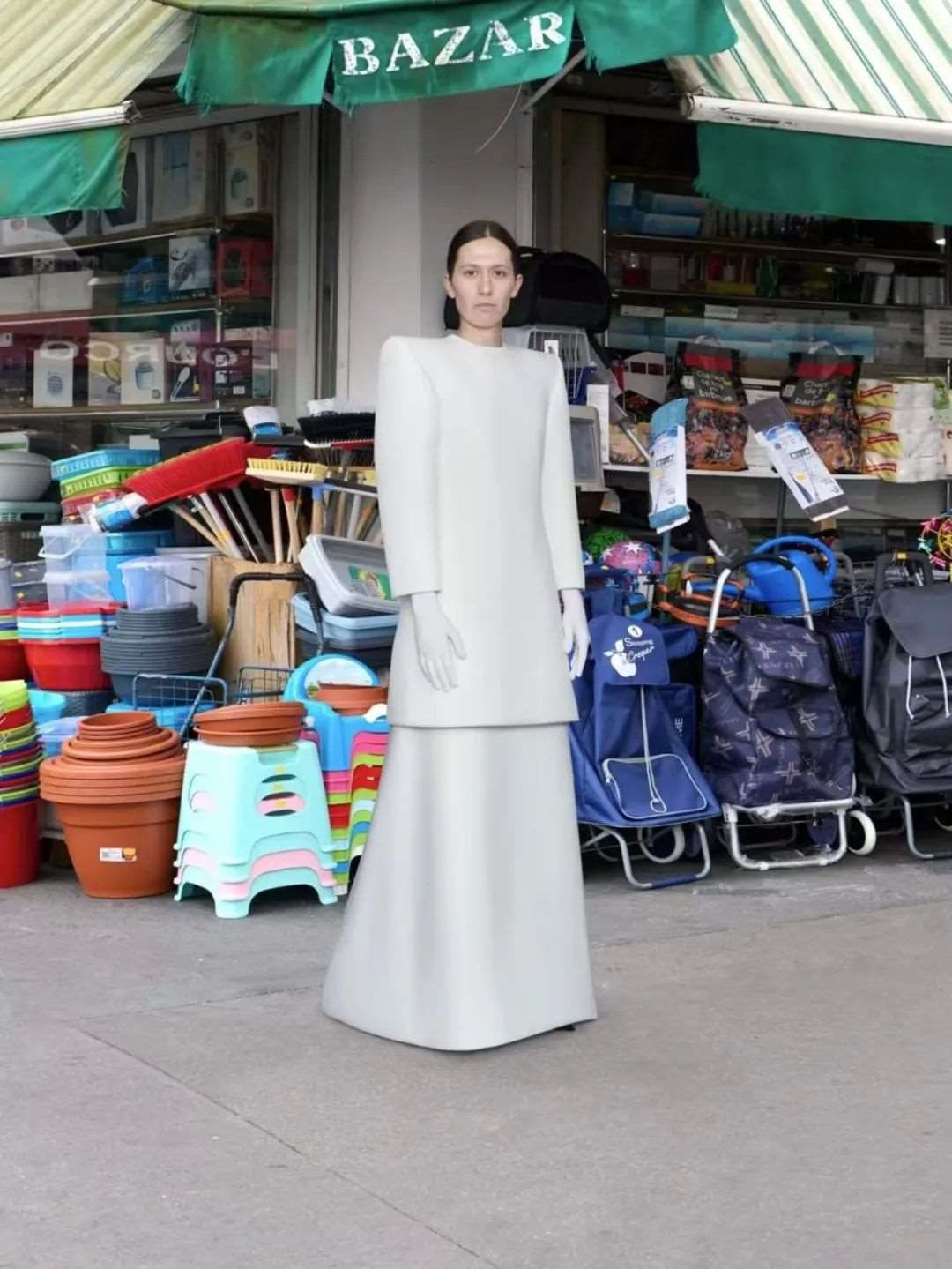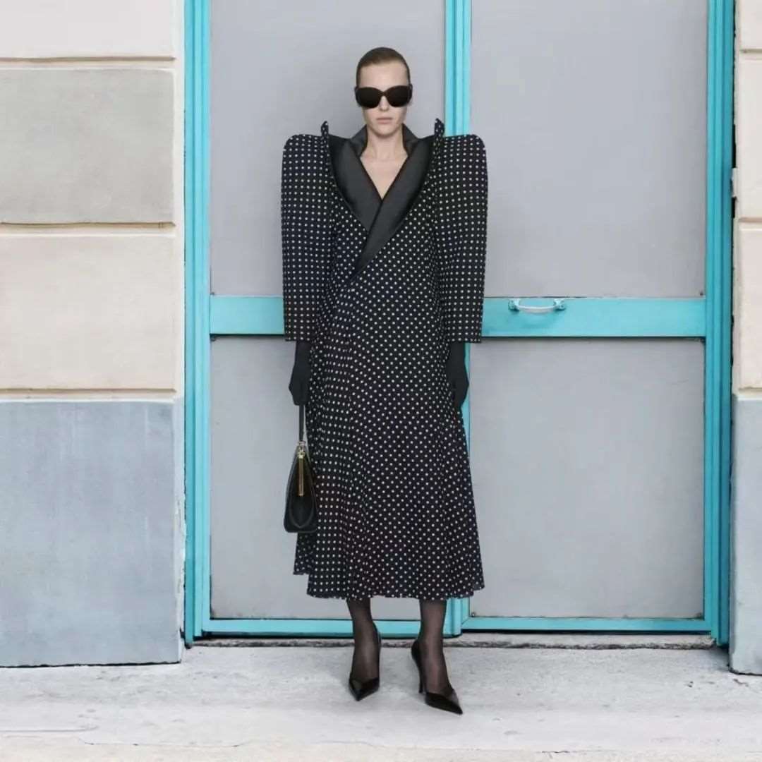 作为Demna在Balenciaga十年生涯的收官之作,以高定视角重新研究着装规范的新式主题。通过回应品牌创始人Cristóbal Balenciaga对完美的定义与追求,雕塑感和建筑性连动成线,探讨女性着装下严肃与宏伟的母题。该系列开场Look致敬Cristóbal Balenciaga的经典设计,复刻了品牌修身廓形裙装并融入了Demna本季的灵感——那不勒斯风格剪裁,呈现优雅又颇具现代风情的设计。当然,Demna个人标志性的风格也不会缺席。夸张的肩部轮廓,宽松的廓形外套以及与之相反的紧身衣,街头风夹克等,是Demna反乌托邦式设计的代表更接地气,和传统高定相比不那么高定。在告别之际,Demna也挖掘了Balenciaga档案中优雅的一面,优雅的礼服剪裁,结合建筑般的立体廓形呈现有棱有角,线条分明,让这些服装更具有立体雕塑属性。