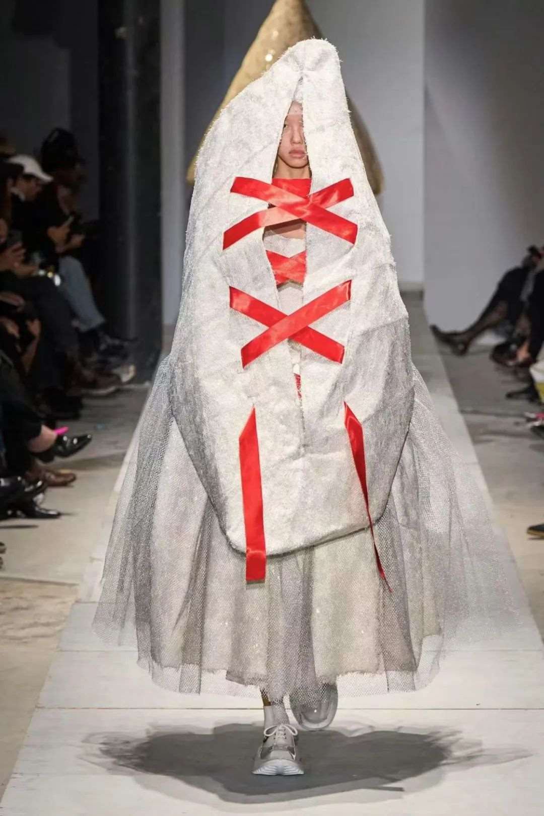 Comme des Gargons 2025 春夏系列继续着这个品牌大胆的独创性精神,再度拒绝常规的时尚规则,冲破常规美学,从怪诞艺术中汲取灵感,通过强化戏剧化的廓形来重新诠释身体与服装这两者间的关系。川久保玲运用标志性的夸张设计语言,呈现了一场怪诞的、装饰性的惊喜时装秀,代表着设计师对于以往愿景的整合与重述。充满空气感的膨胀大体积主导着这些奇形怪状的造型,搭配用网纱和刺绣蕾丝制作的古怪帽饰,缔造了一种天马行空的立体3D建筑感效果。